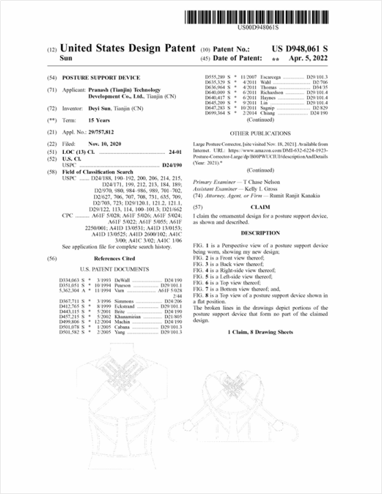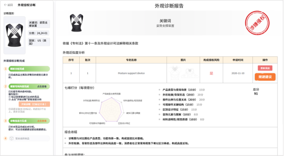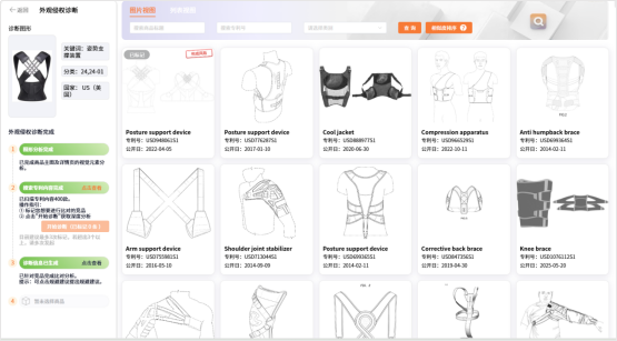 以一款在售矫正带为例,通过知篱系统“专利查侵”功能进行检测,系统快速识别出其与涉案专利存在多处高度相似的设计特征。下图清晰展示了产品与专利图示的对比情况,帮助卖家直观理解侵权风险点: