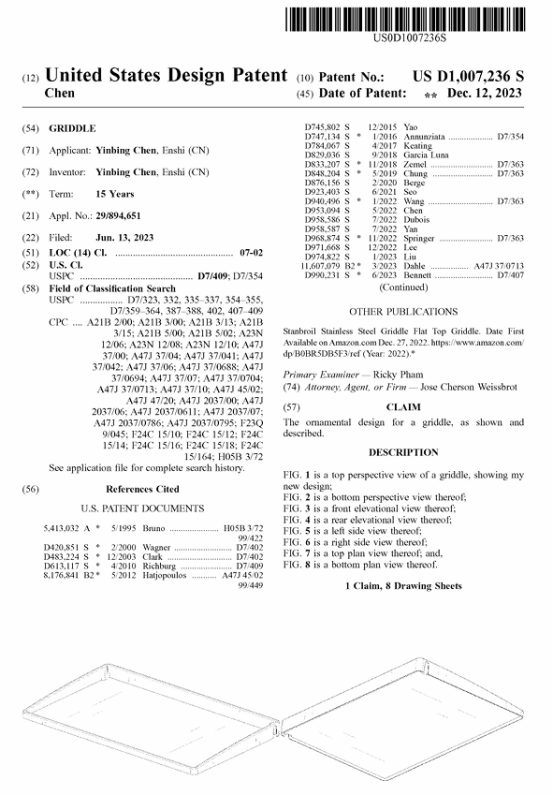 本案所涉专利为Yinbing Chen于2023年12月12日在美国注册的专利号为:USD1007236S的煎锅产品。