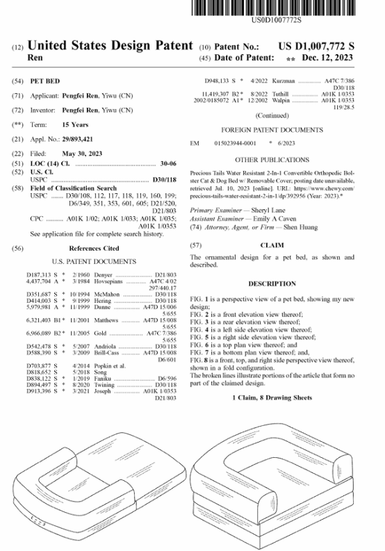 Pengfei Ren(涉案人宠折叠床外观专利持有人)原告是一位中国义乌跨境电商卖家,结合公开信息拟为专注于人宠用品相关专利布局的主体,涉案专利人宠折叠床专利编号为USD1007772S已于2023年12月12日在美国注册,具备可折叠、便于收纳、适用于宠物休息等核心特征,为宠物和人提供了人宠共同享用的休息空间,又便于折叠携带,配上舒适的毛毯,既温暖舒适,又便于拆装清洗。
